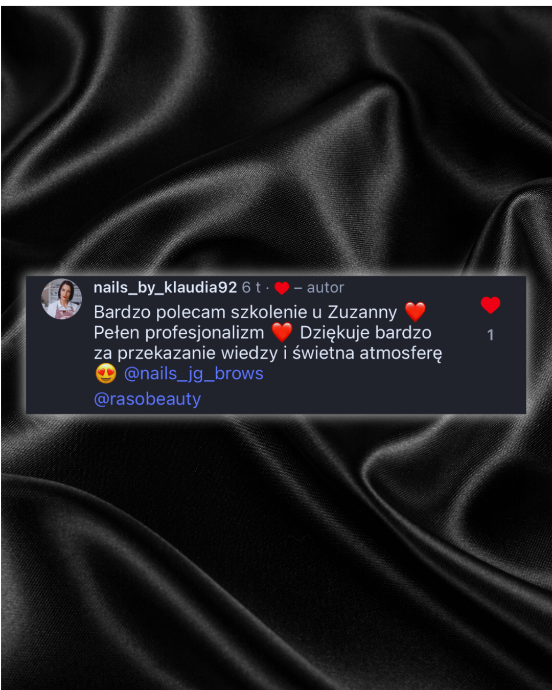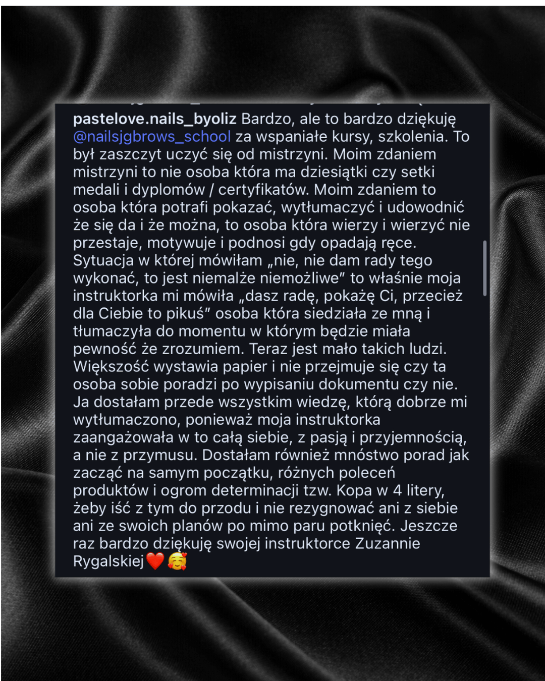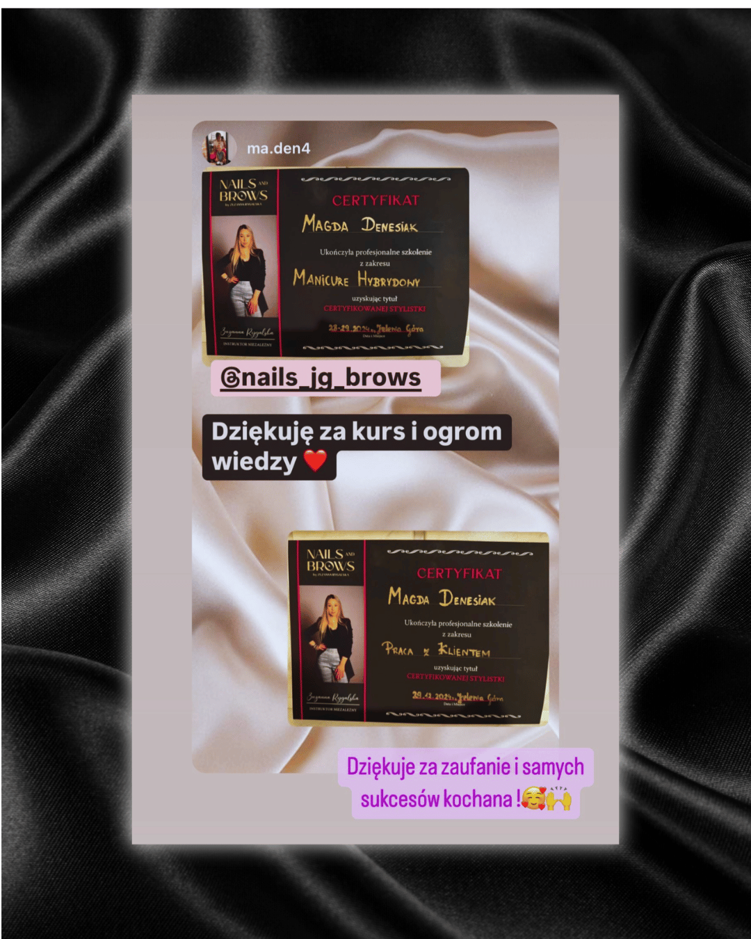 Od tego momentu pochłonęła mnie ta wiedza i z roku na rok zdobywałam jej jeszcze więcej poprzez odbyte szkolenia z różnej tematyki w zakresie wykonywania stylizacji paznokci, nabyłam ogrom wiedzy który cały czas pogłębiam, a także wzięłam udział w mistrzostwach w których zajęłam pierwsze oraz drugie miejsce.