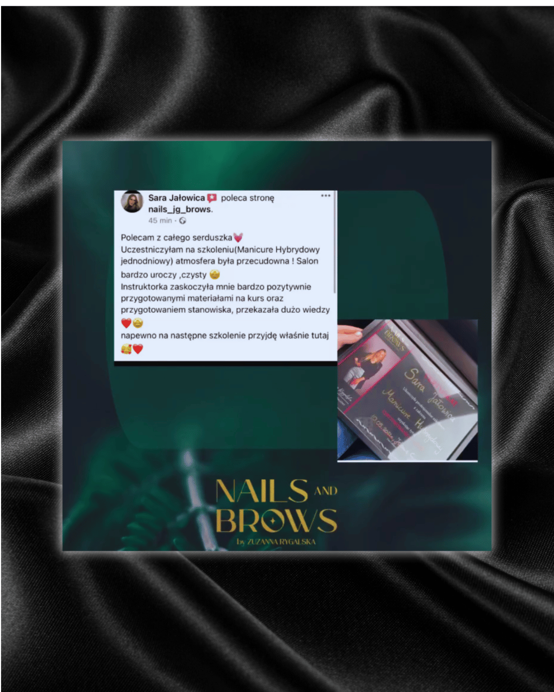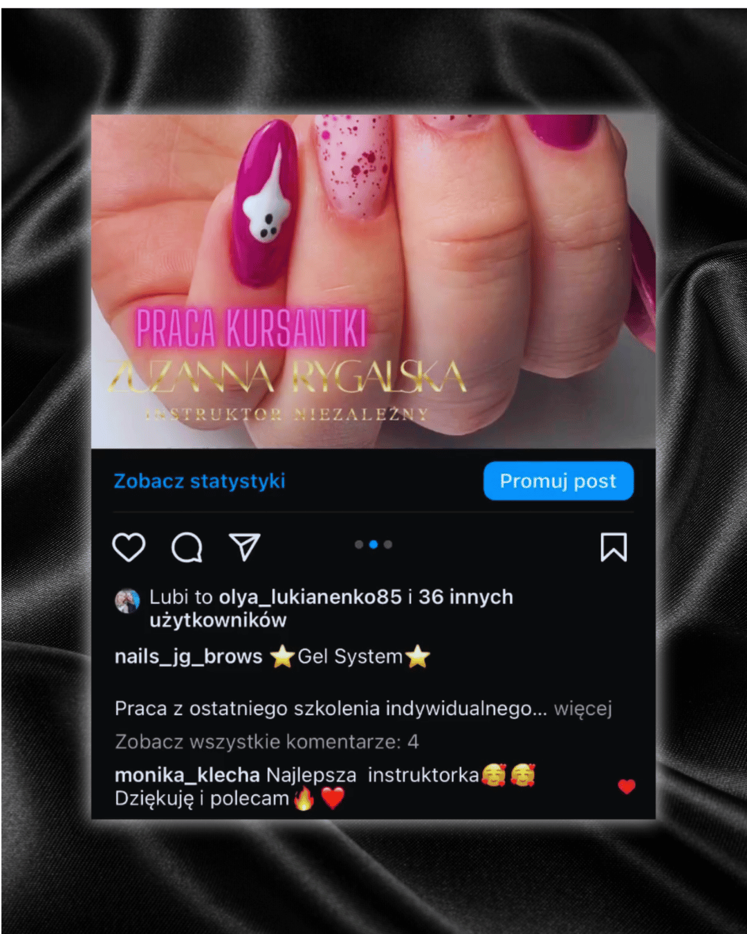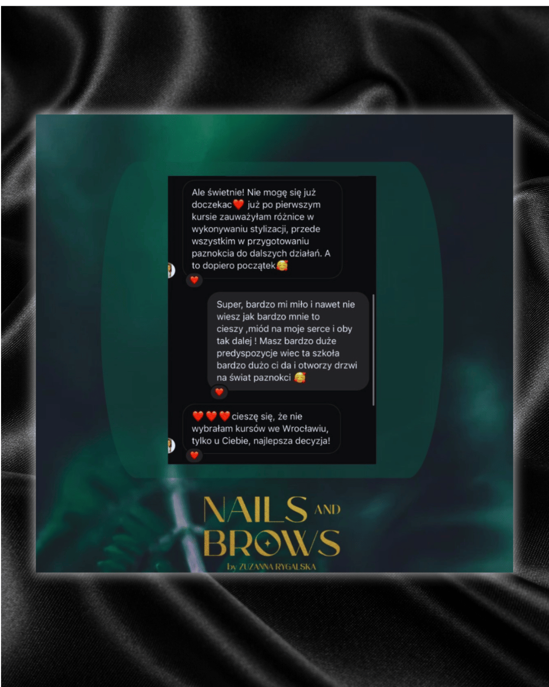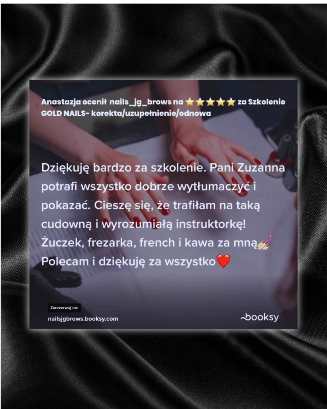 Co mnie skłoniło do wyboru akurat tego zawodu? Praca z klientkami a bardziej uszczęśliwianie ich to jedno, natomiast drugie – uwielbiam malować,tworzyć ręcznie rysunki, zdobienia dzięki temu spełniam się w swojej pracy w 100% a dodatkowo w momencie przekazywania wam wiedzy którą gromadzę od lat.